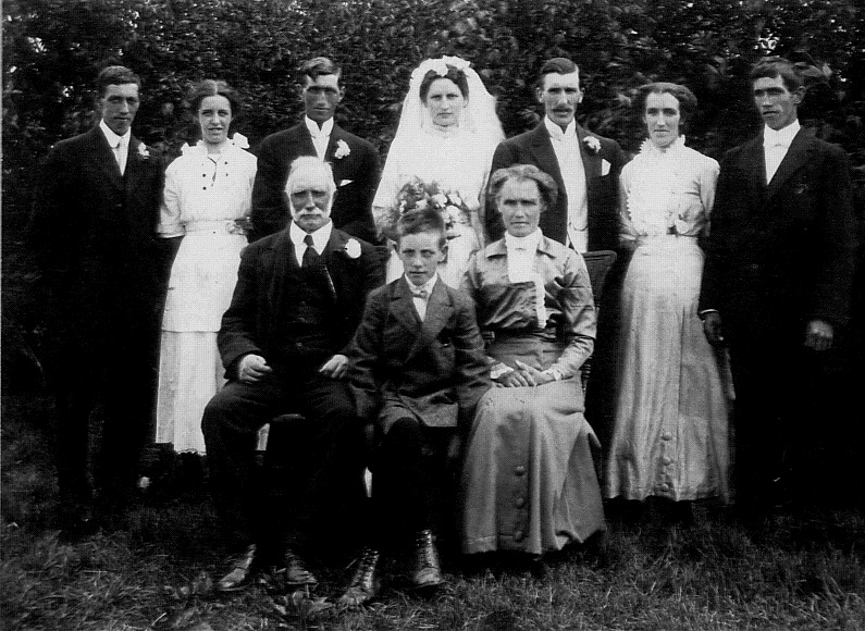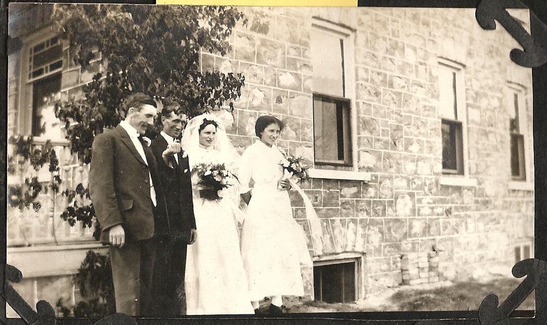 L to R: Parents of the groom, Thomas Watson and his wife Jane Watson, groom James (Jim) Watson, bride Agnes (Nancy) Watson and parents of the bride Janet and Samuel Acton. The photograph was taken in the vegetable garden – see the sticks with seed package covers to mark the rows in the lower left of the photo.