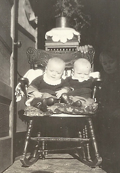 Photo left: Inglis twins Ken & Gordon Location – same as above photo. Taken probably in the summer of 1925 (the uncropped photo shows this photo is in the front doorway, during warm weather).